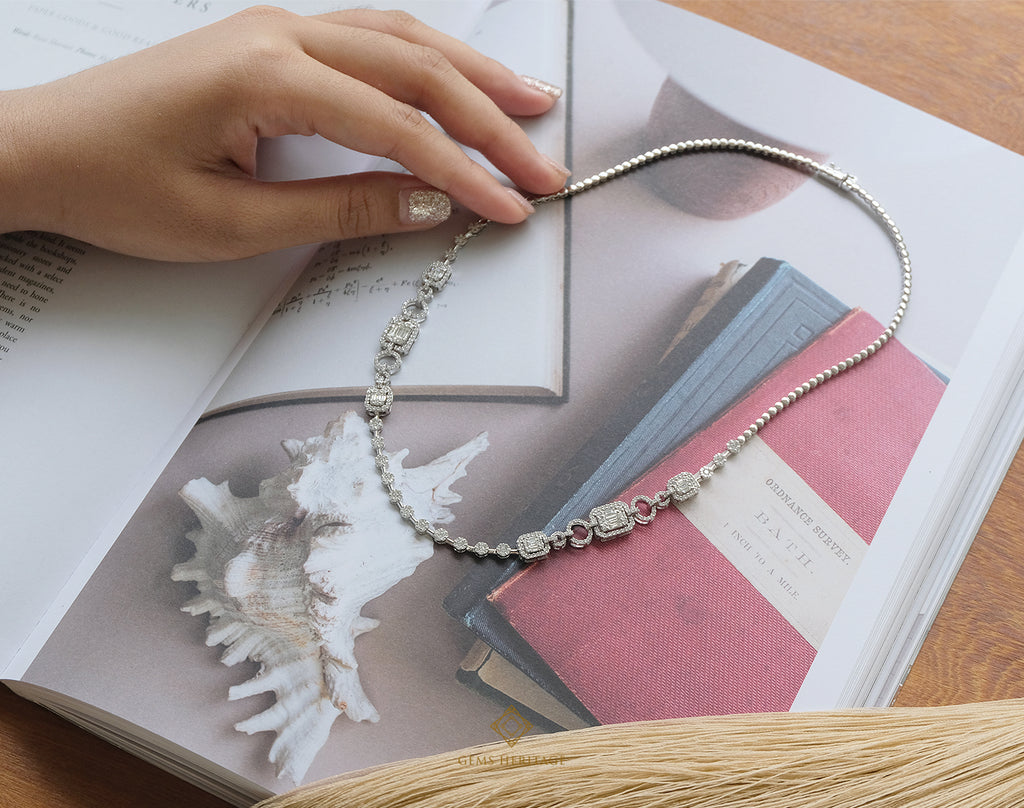 Emerald cut and circle diamond necklace